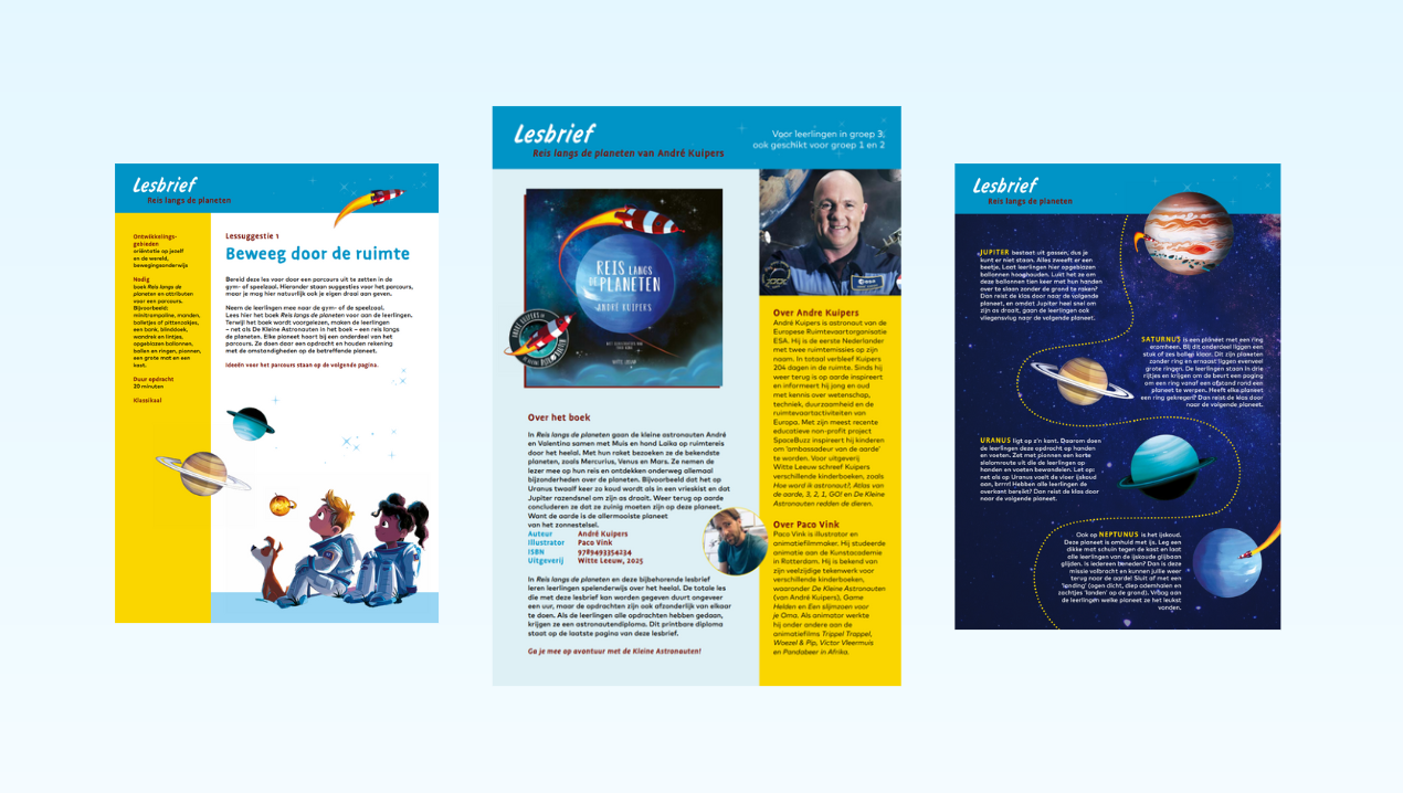 De ervaringen die astronaut André Kuipers opdeed in de ruimte, deelt hij onder andere in zijn kinderboeken. Uitgeverij Witte Leeuw vroeg Firma Fluks een lesbrief te maken bij zijn nieuwste prentenboek Reis langs de planeten